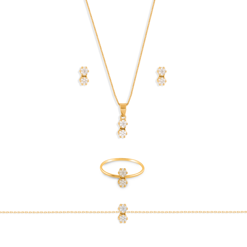 طرح فلاور با نگین‌های ظریف یکی از محبوب‌ترین طرح‌ها در زیورآلات زنانه‌ است که هیچوقت قدیمی نمی‌شود. این سرویس طلا شامل یک آویز به همراه زنجیر، دستبند، انگشتر و یک جفت گوشواره است. ظرافت و زیبایی این سرویس طلا آن را به یک گزینه‌ی عالی برای استفاده‌های روزانه و نیمه‌رسمی تبدیل کرده‌است.